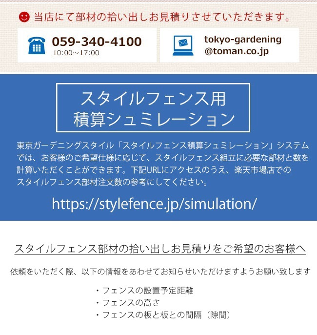 TEL: 059-340-4100 メールアドレス:tokyo-gardening@toman.co.jp 商品送付先:〒513-0001三重県鈴鹿市広瀬町2720 株式会社東万 鈴鹿展示場